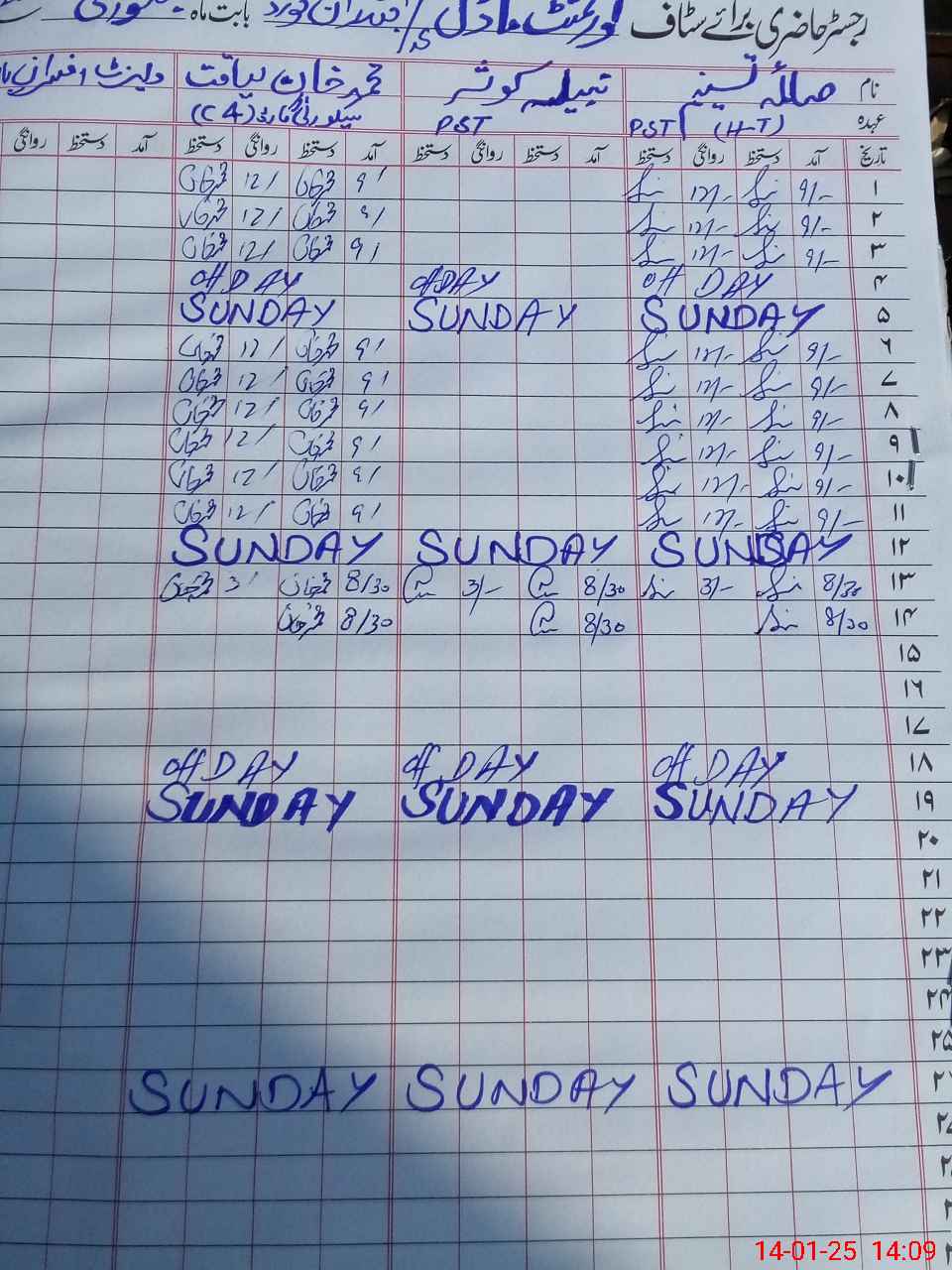 | CNIC | Full Name | Designation | R/C | Absence During Last Calender Month |