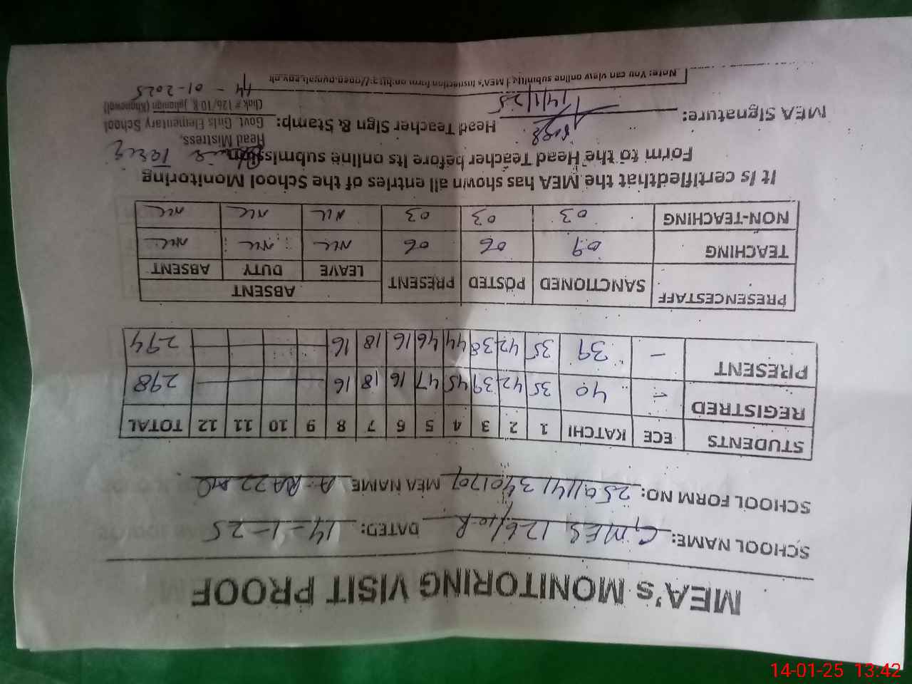 | Attendance Register | Head Teacher | MEA with School | Visit Proof |