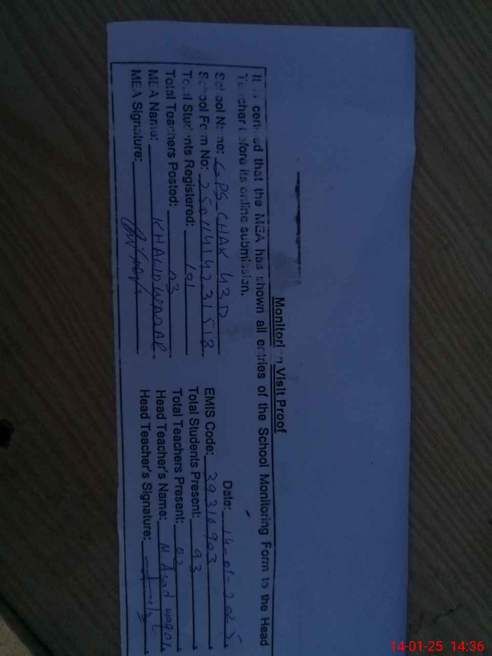 | Attendance Register | Head Teacher | MEA with School | Visit Proof |
