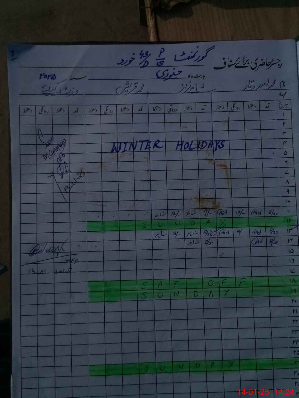 | CNIC | Full Name | Designation | R/C | Absence During Last Calender Month |