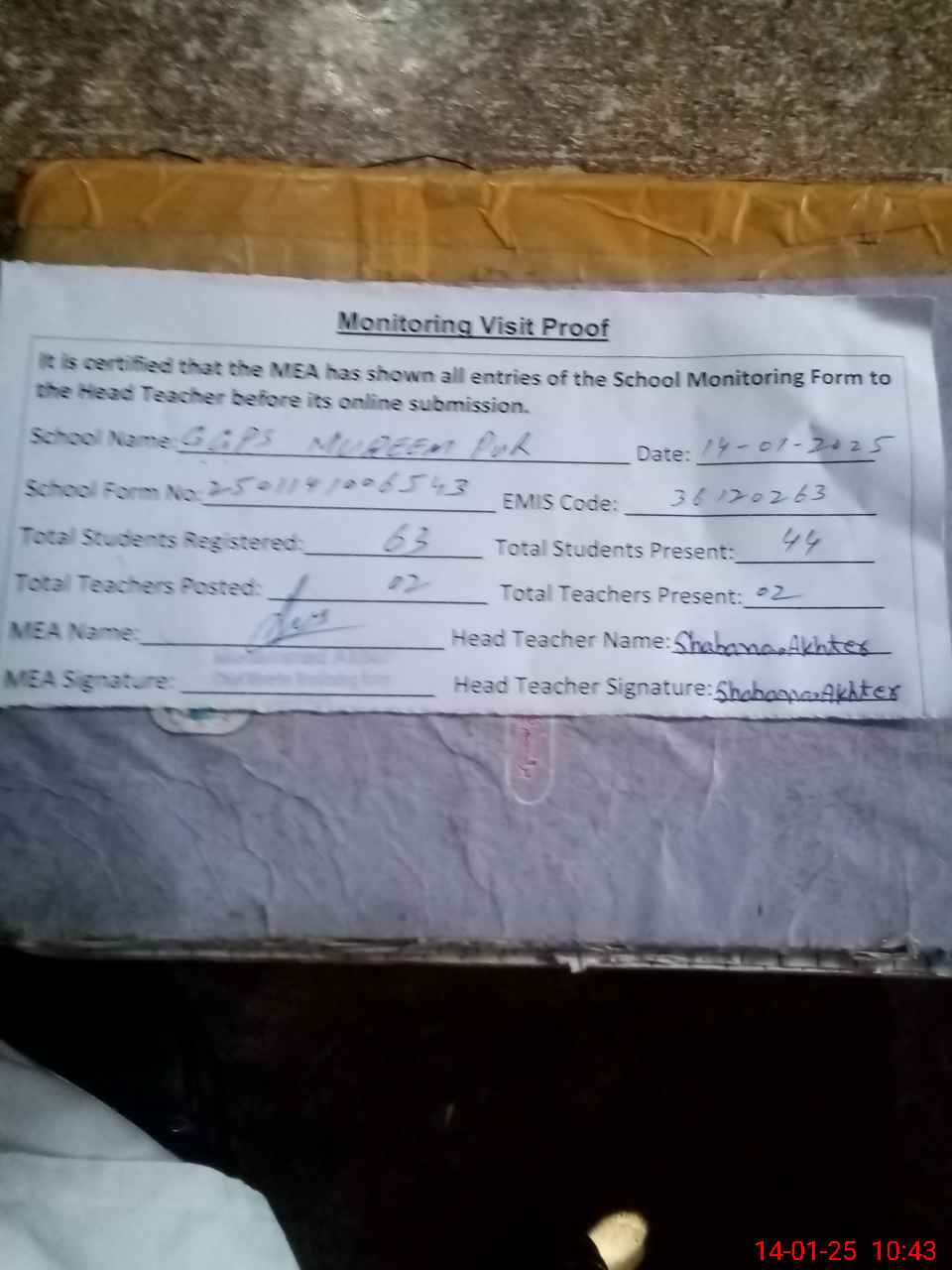 | Attendance Register | Head Teacher | MEA with School | Visit Proof |