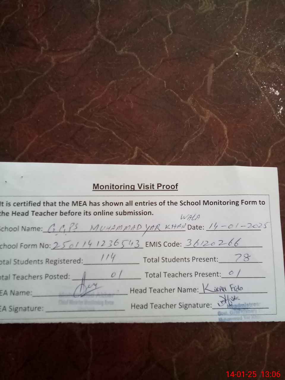 | Attendance Register | Head Teacher | MEA with School | Visit Proof |