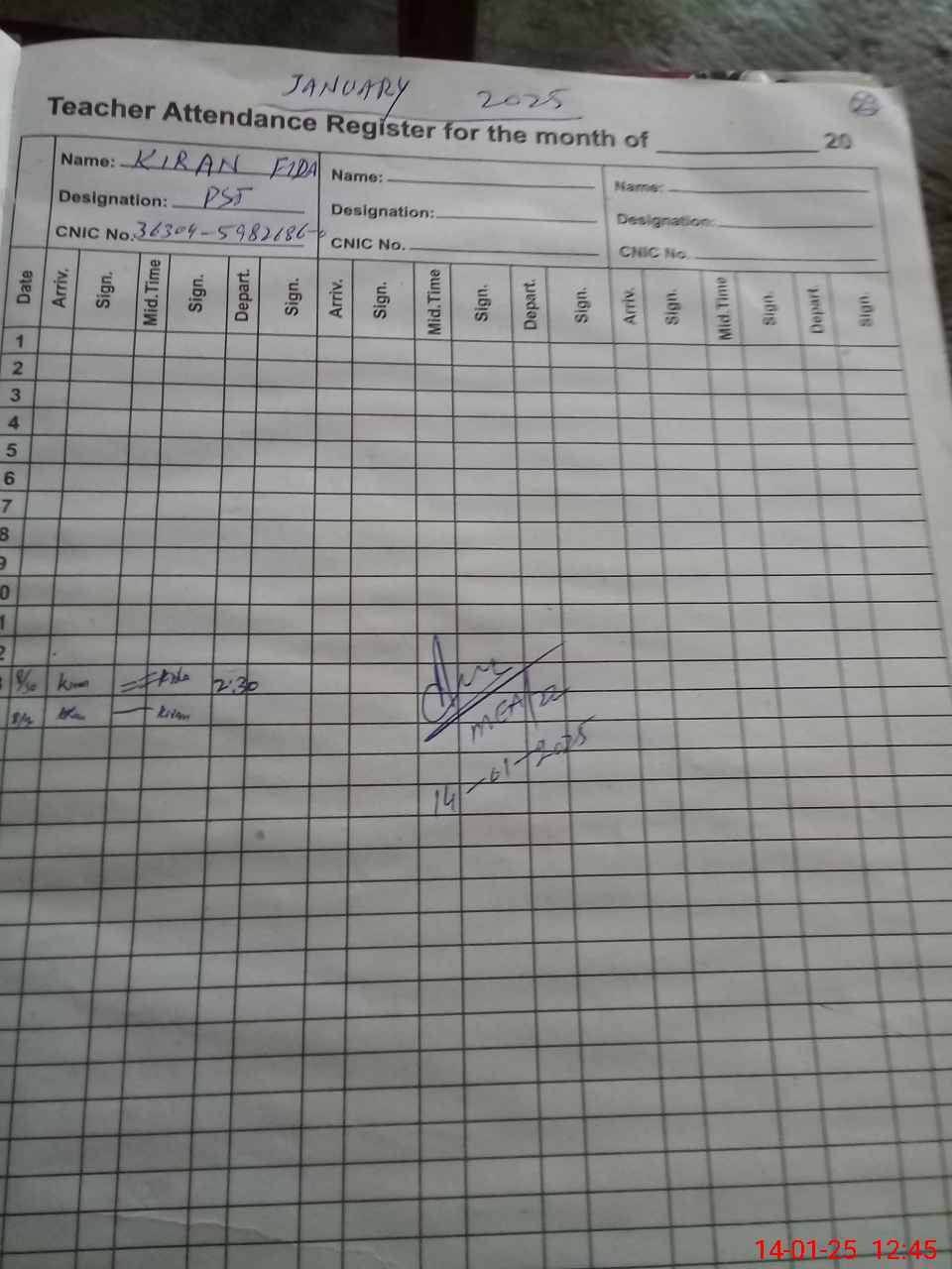| CNIC | Full Name | Designation | R/C | Absence during last cal. month |