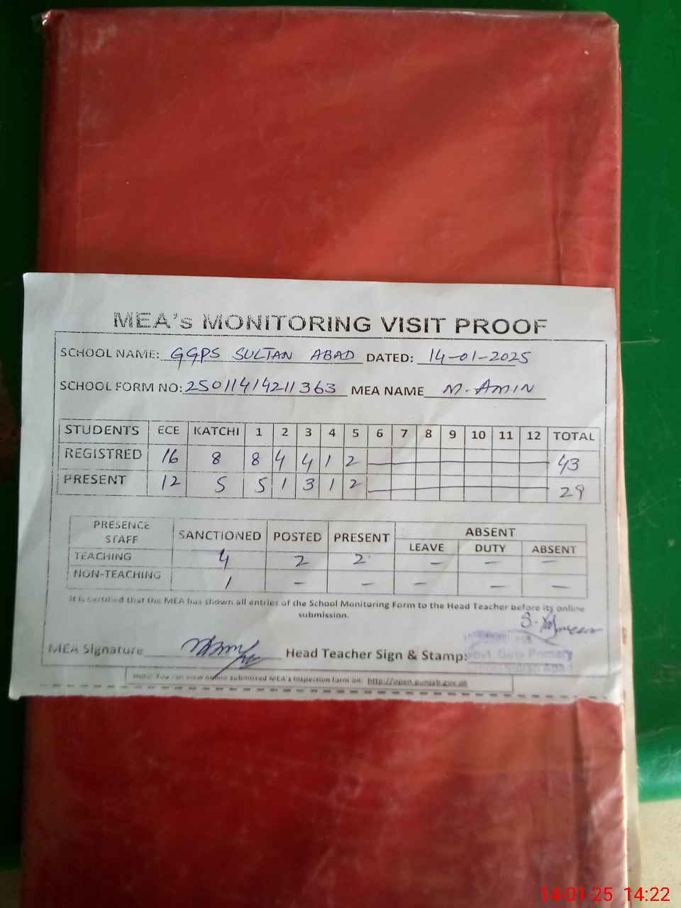| Attendance Register | Head Teacher | MEA with School | Visit Proof |