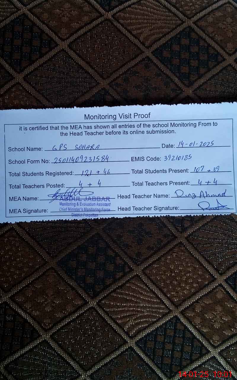 | EMIS Code: 39210185 | Name of School: GPS SOHARA | |||