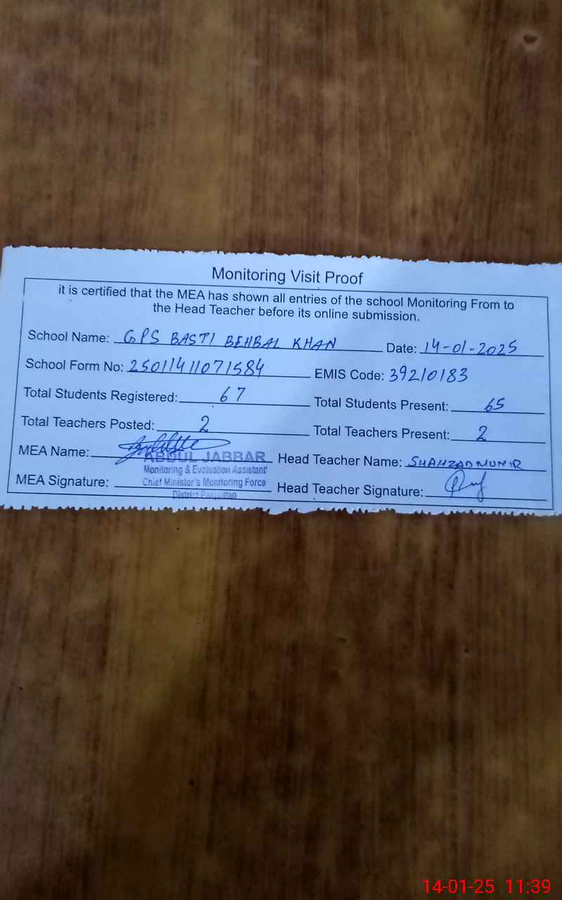 | EMIS Code: 39210183 | Name of School: GPS BASTI BEHBAL KHAN PAKPATTAN | |||