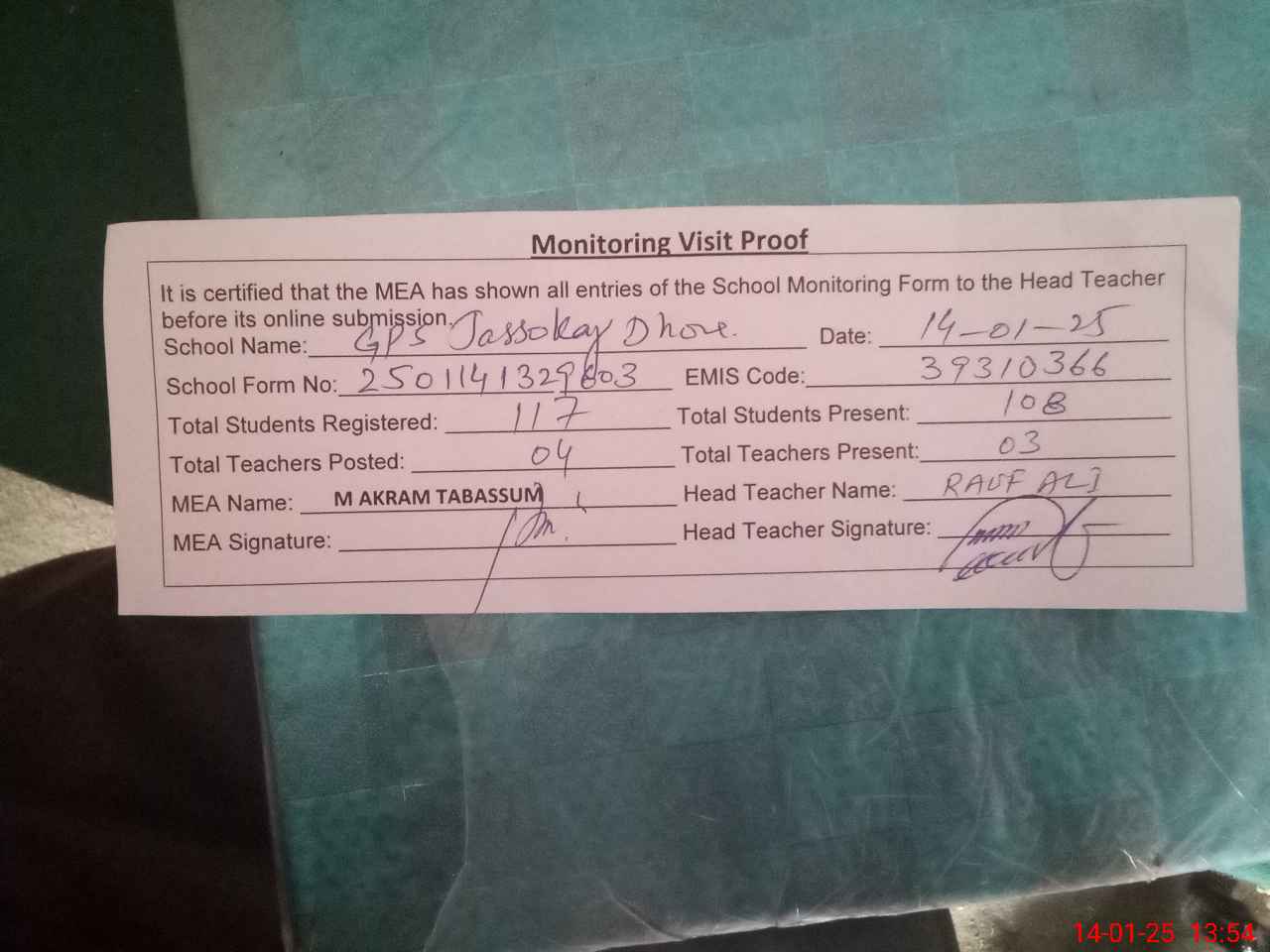 | Attendance Register | Head Teacher | MEA with School | Visit Proof |