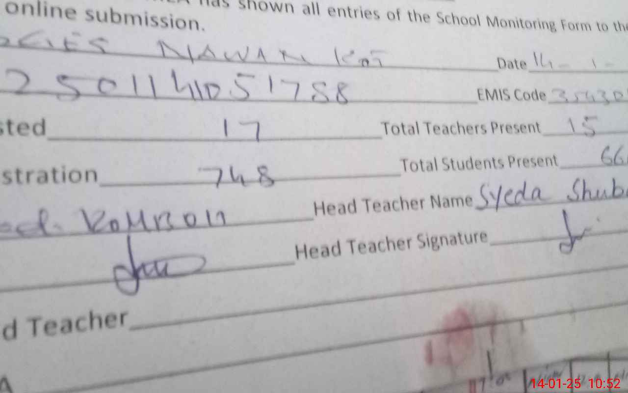| Attendance Register | Head Teacher | MEA with School | Visit Proof |