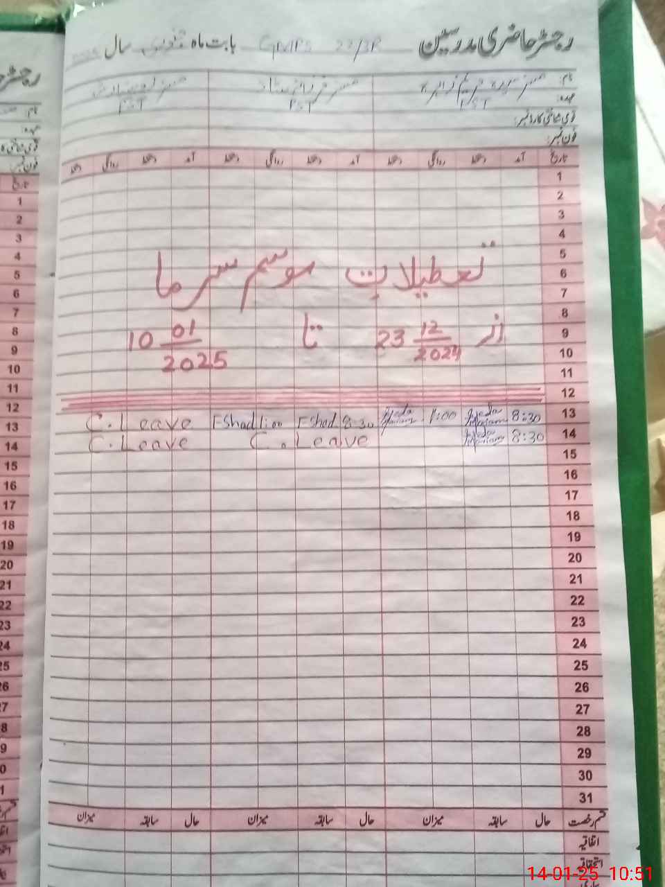 | CNIC | Full Name | Designation | R/C | Absence During Last Calender Month |