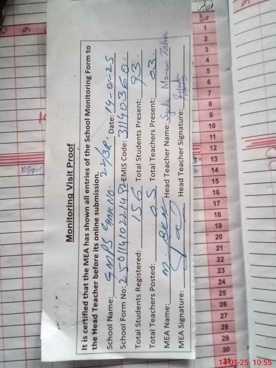 | Attendance Register | Head Teacher | MEA with School | Visit Proof |