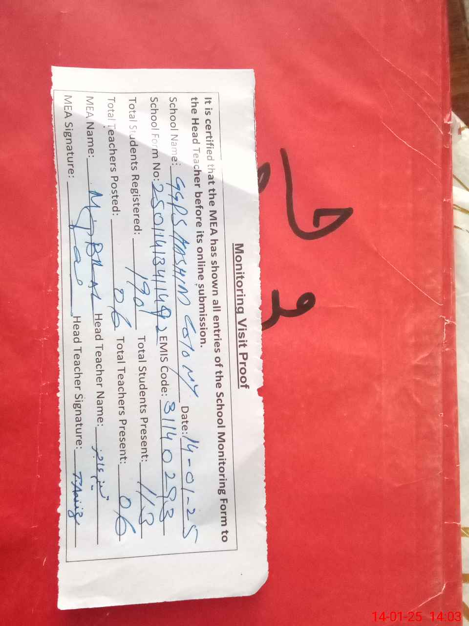 | Attendance Register | Head Teacher | MEA with School | Visit Proof |