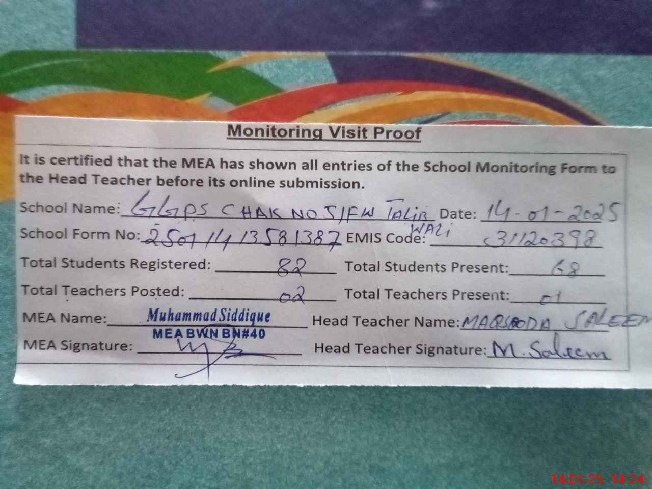 | Attendance Register | Head Teacher | MEA with School | Visit Proof |