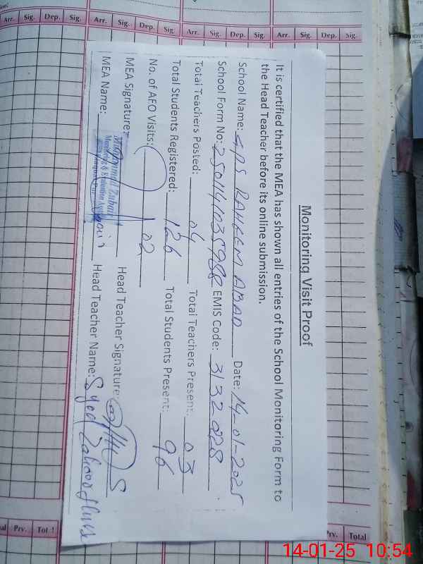 | Attendance Register | Head Teacher | MEA with School | Visit Proof |