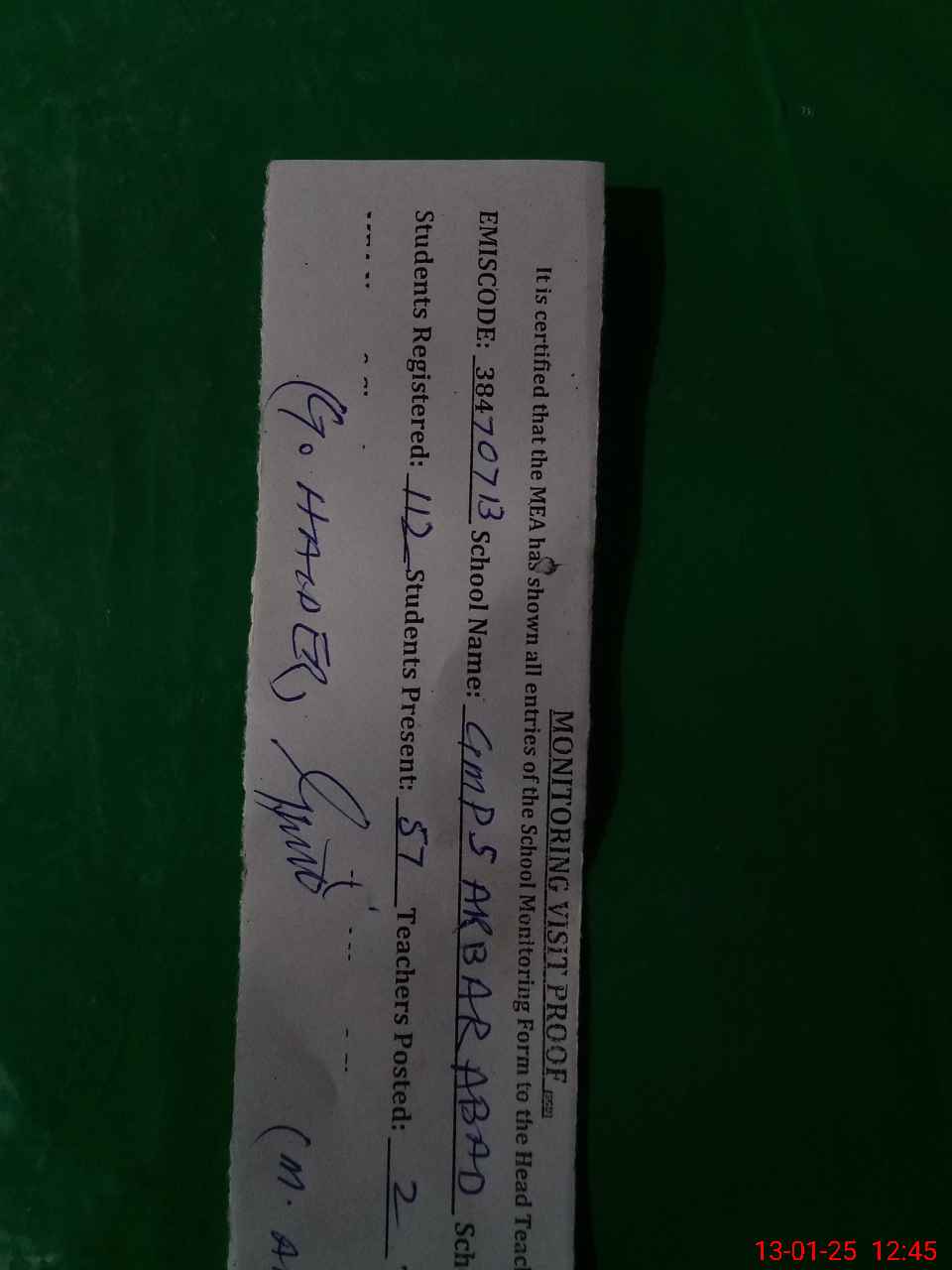| Certified that this School was Inspected by the Undersigned MEA/DMO Today and the Information Stated Above is as Per Record. | |||||