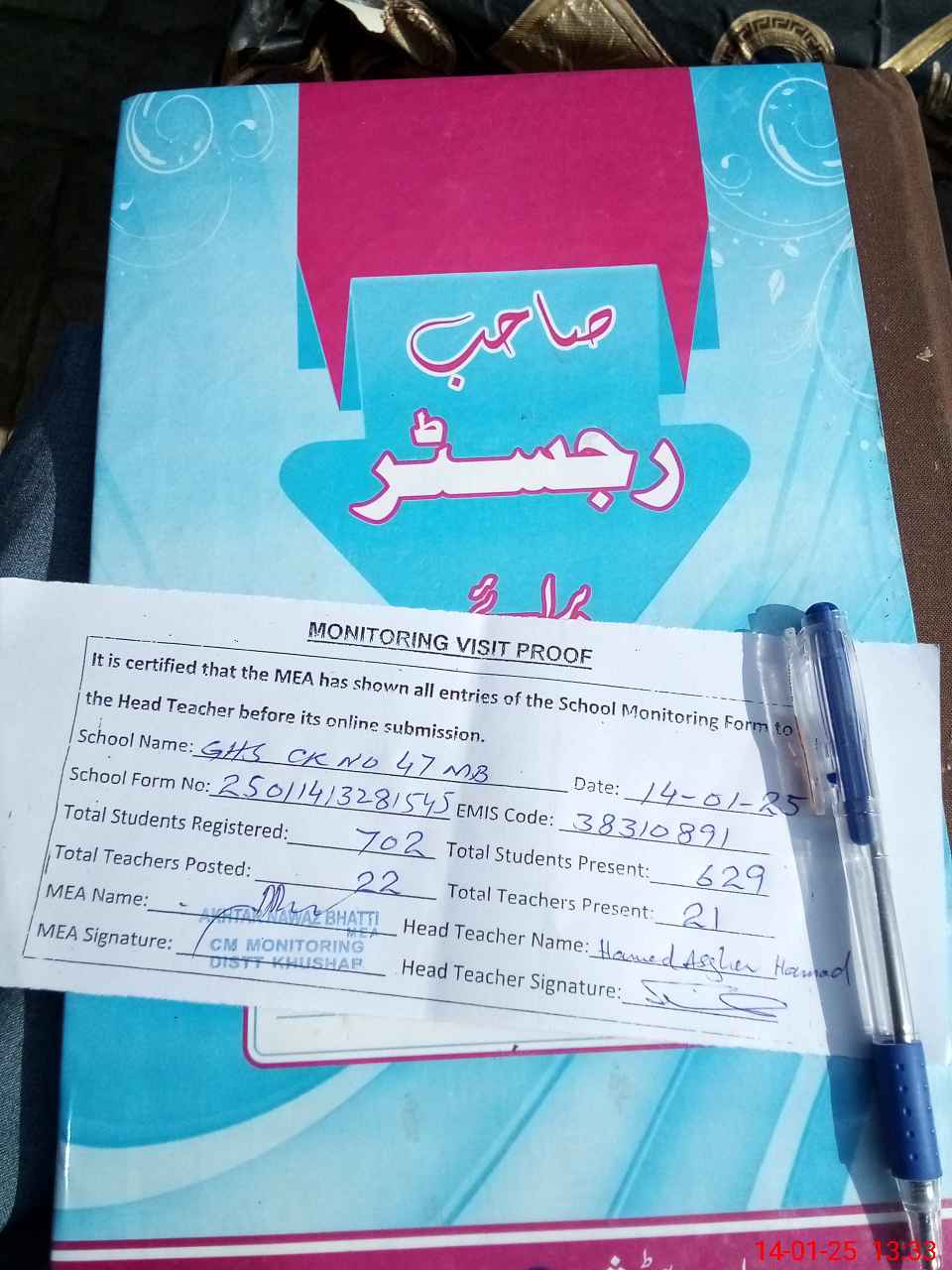| EMIS Code: 38210891 | Name of School: GHS CHAK NO. 47/MB | |||