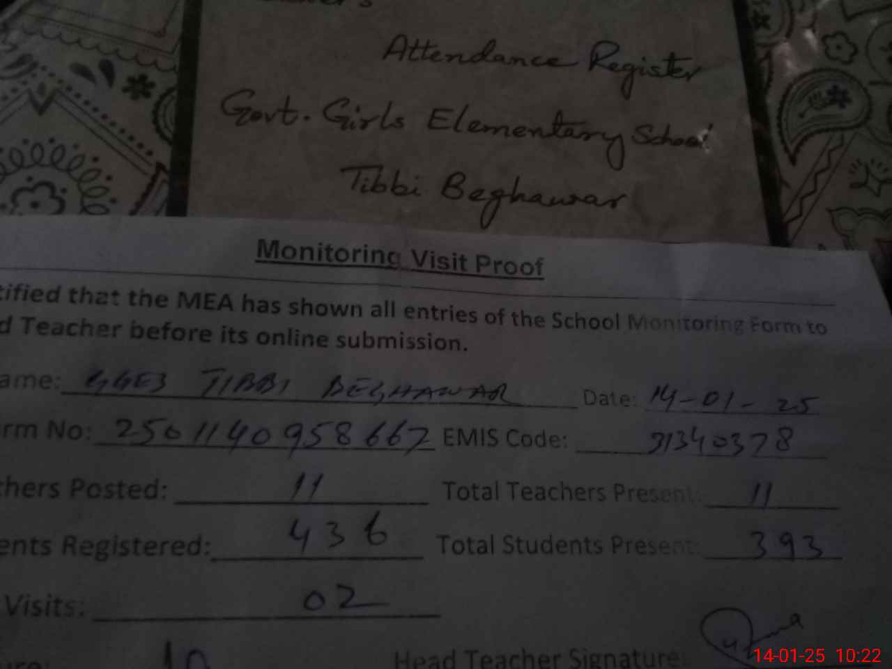 | Attendance Register | Head Teacher | MEA with School | Visit Proof |