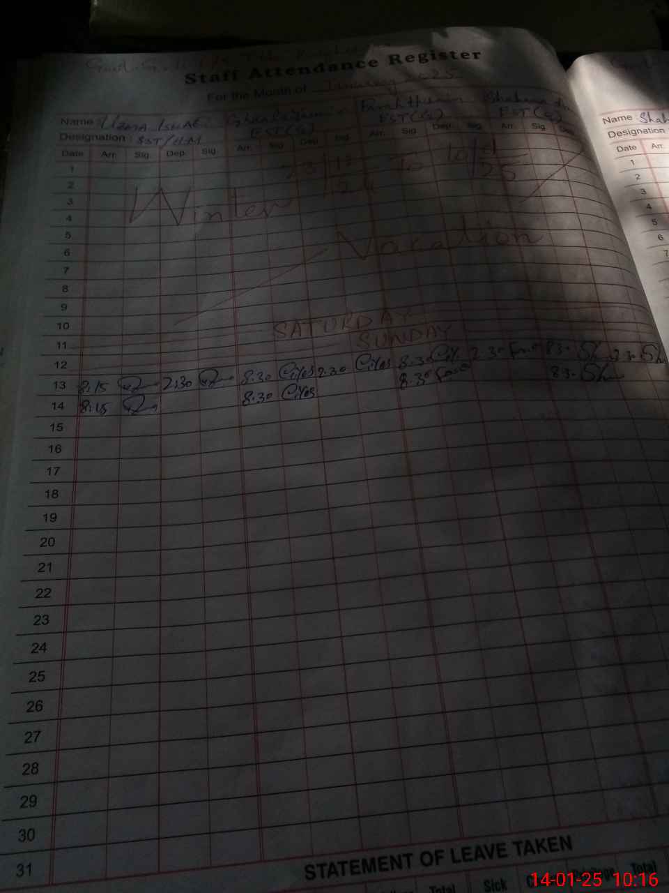 | Leave | Duty | Absent | Maternity | Medical | Ex- Pak |