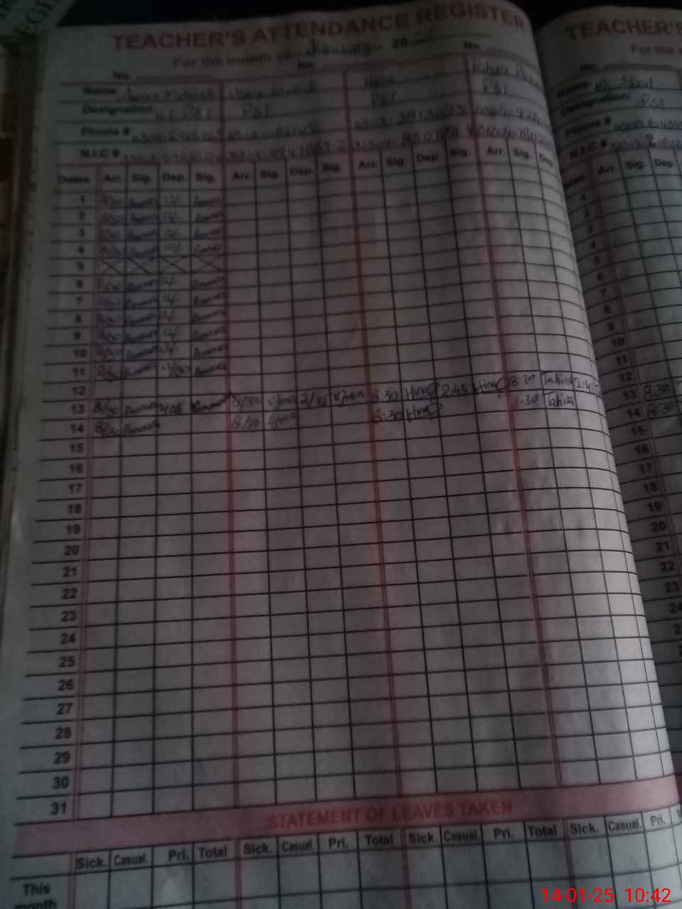 | CNIC | Full Name | Designation | R/C | Absence During Last Calender Month |