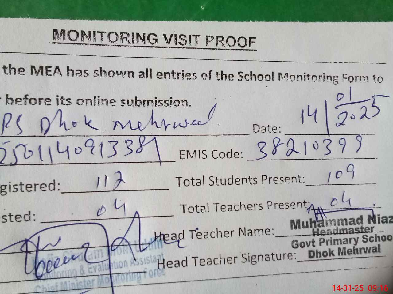 | Attendance Register | Head Teacher | MEA with School | Visit Proof |