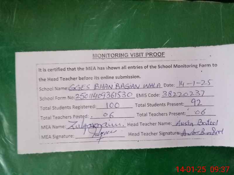 | EMIS Code: 38220237 | Name of School: GGES BHAN BAGIAN WALA | |||