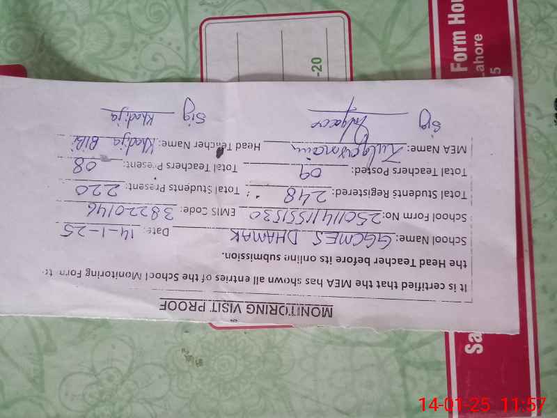 | EMIS Code: 38220146 | Name of School: GGCMHS DHAMAK | |||
