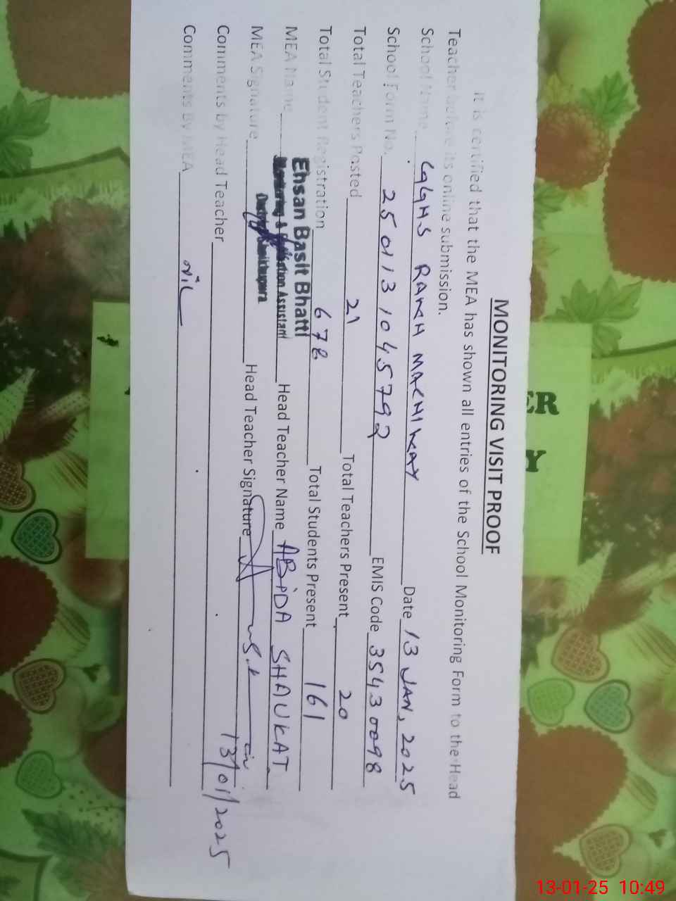 | Attendance Register | Head Teacher | MEA with School | Visit Proof |