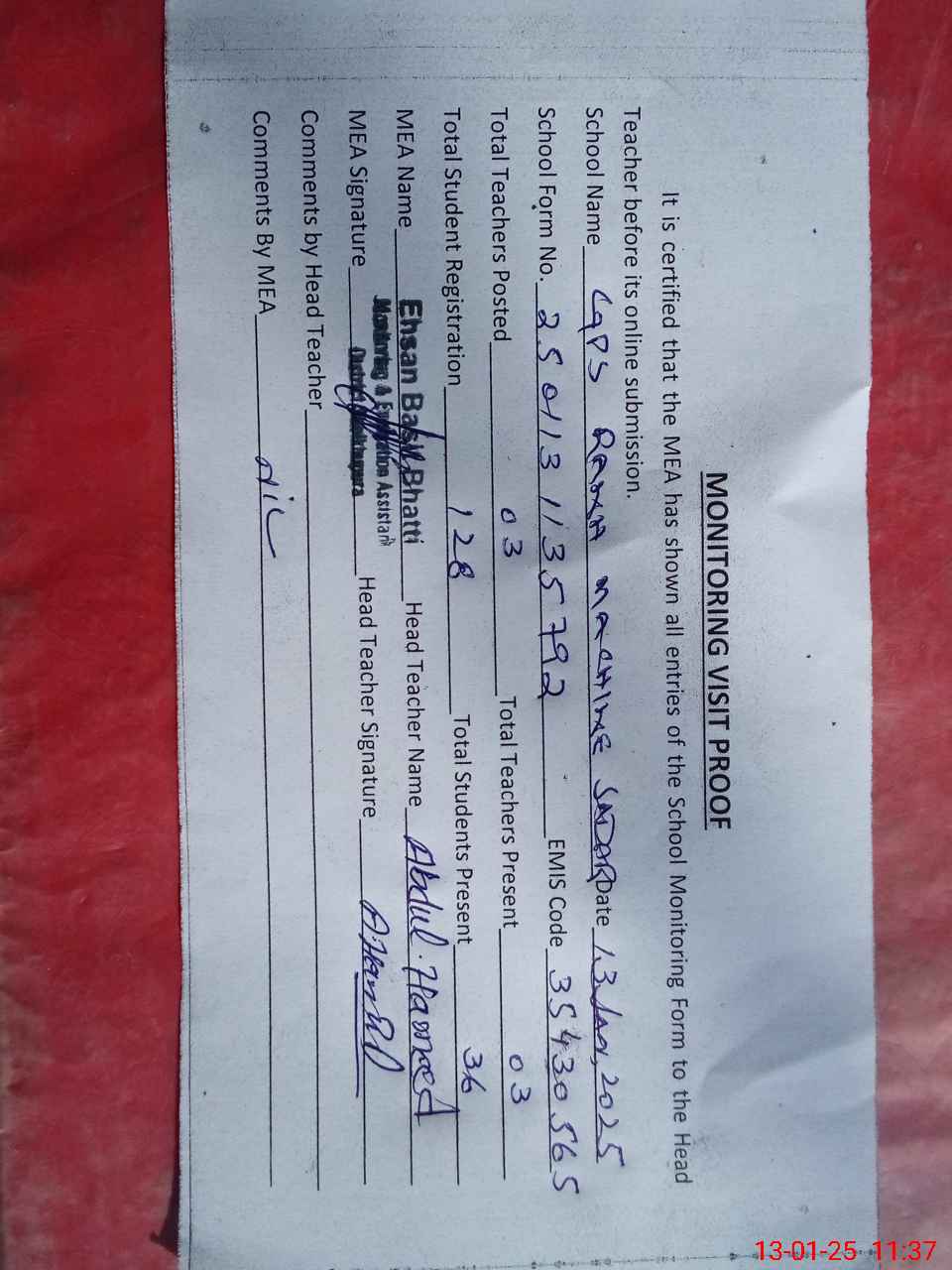 | Attendance Register | Head Teacher | MEA with School | Visit Proof |