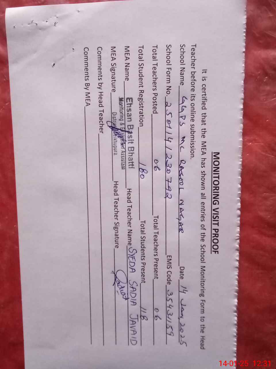 | EMIS Code: 35431159 | Name of School: GGPS MC RASOOL NAGAR | |||