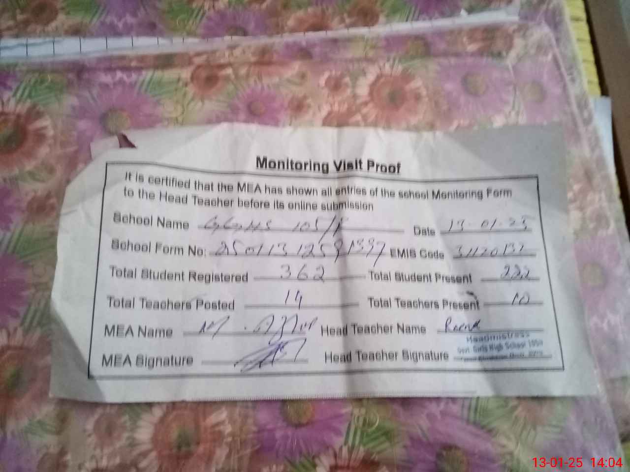 | EMIS Code: 31120132 | Name of School: GGHS CHAK NO. 105/F | |||