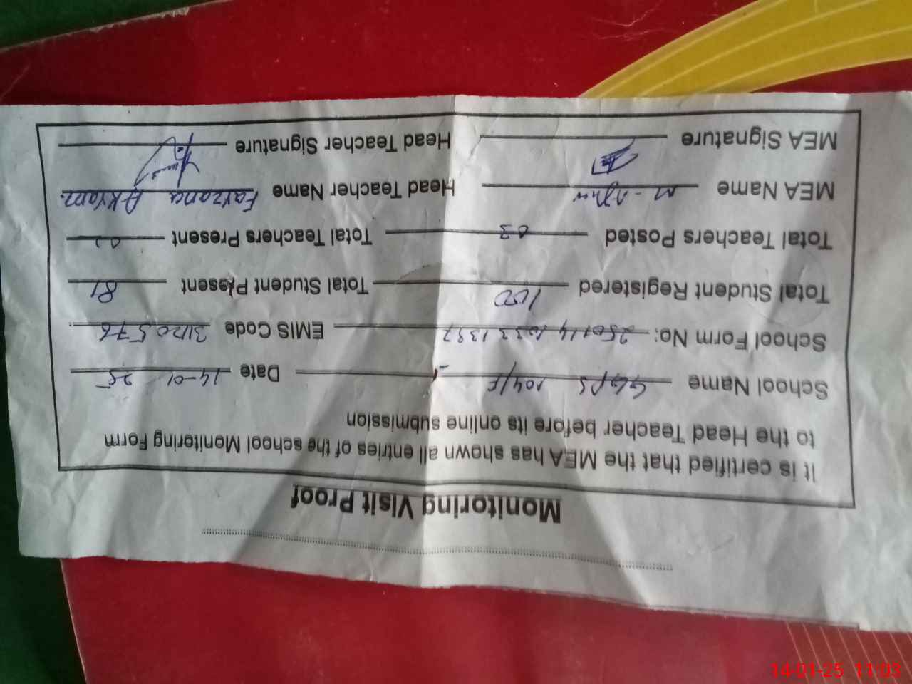 | Attendance Register | Head Teacher | MEA with School | Visit Proof |