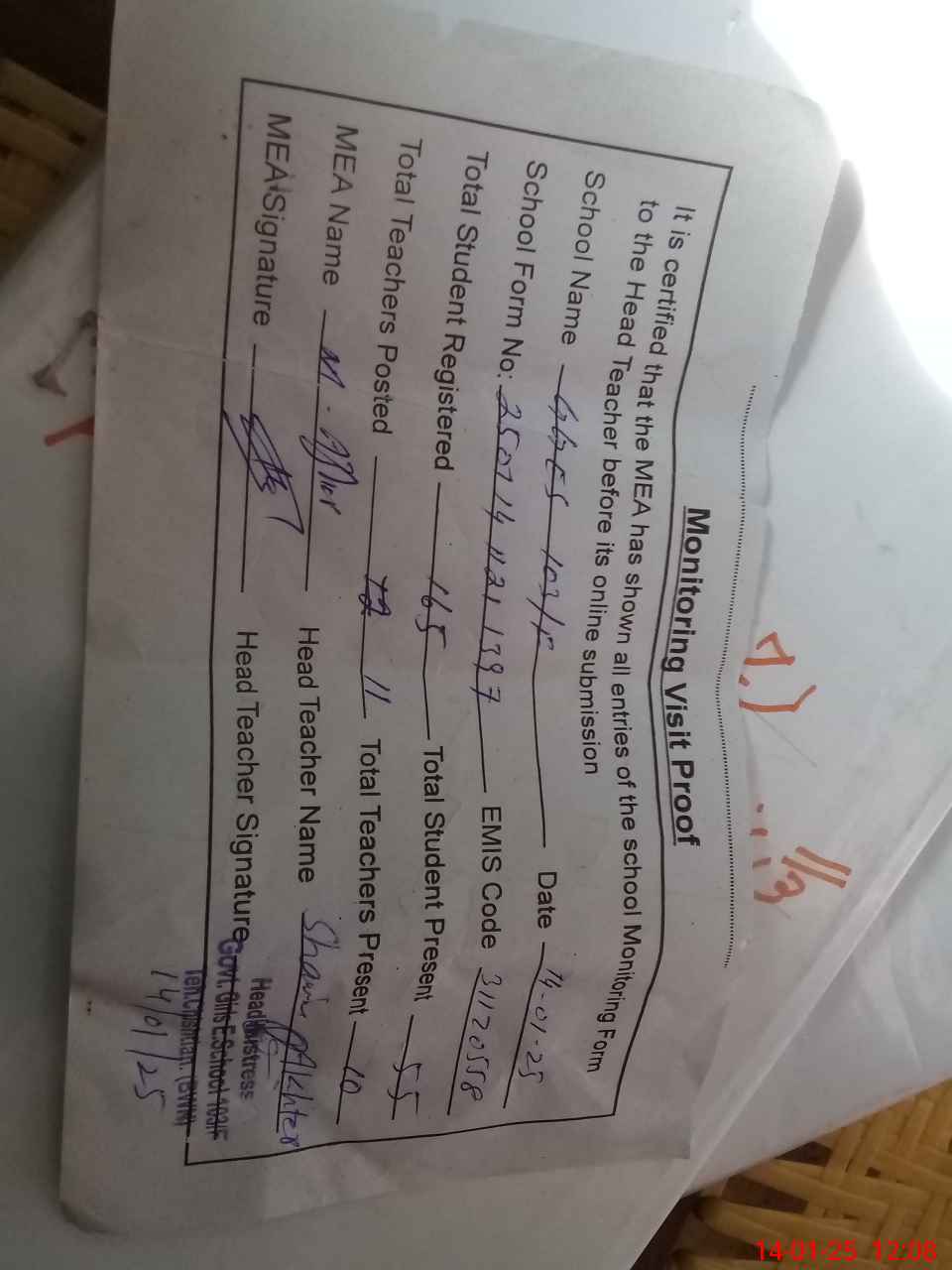 | Attendance Register | Head Teacher | MEA with School | Visit Proof |