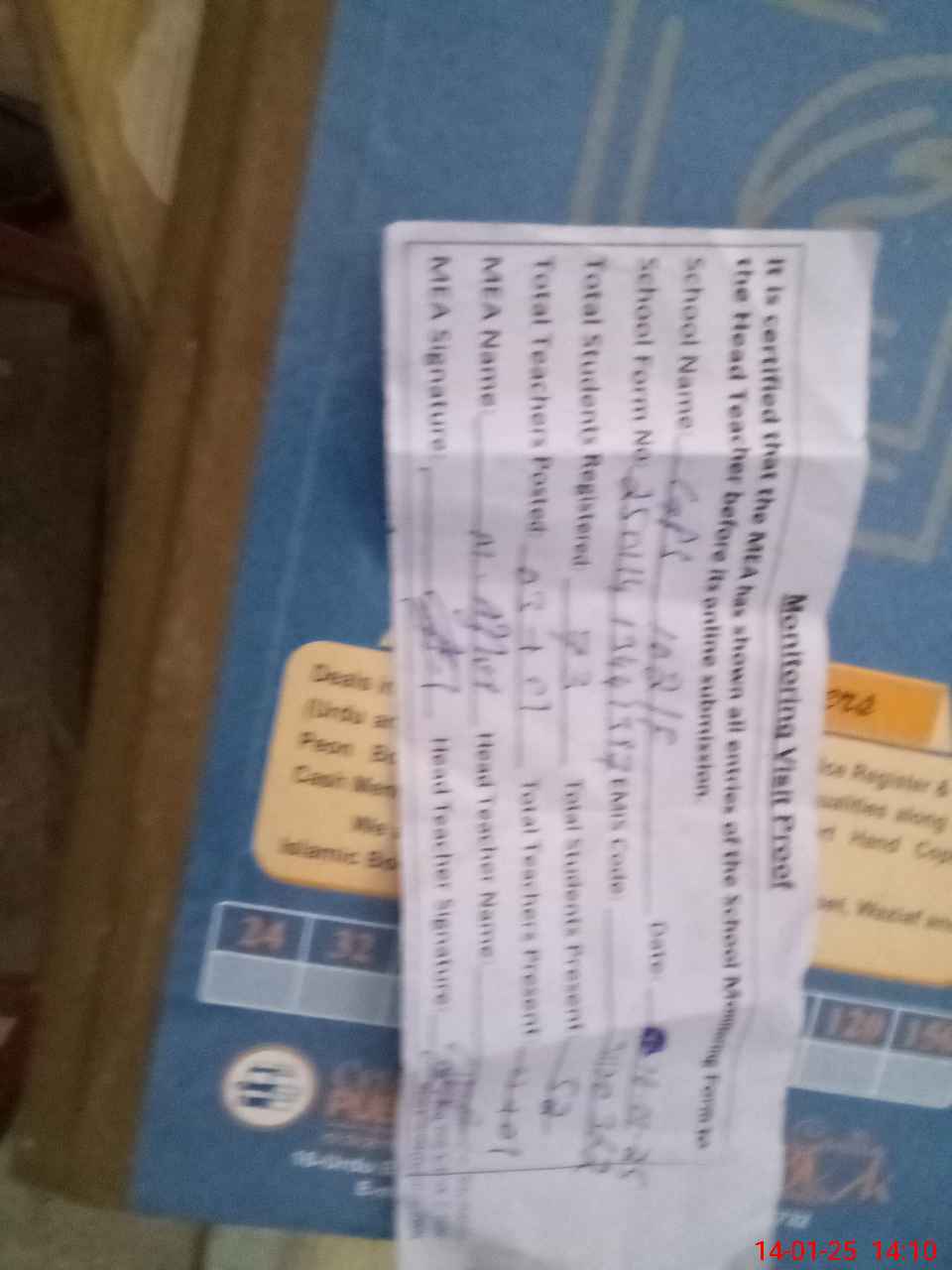 | Attendance Register | Head Teacher | MEA with School | Visit Proof |