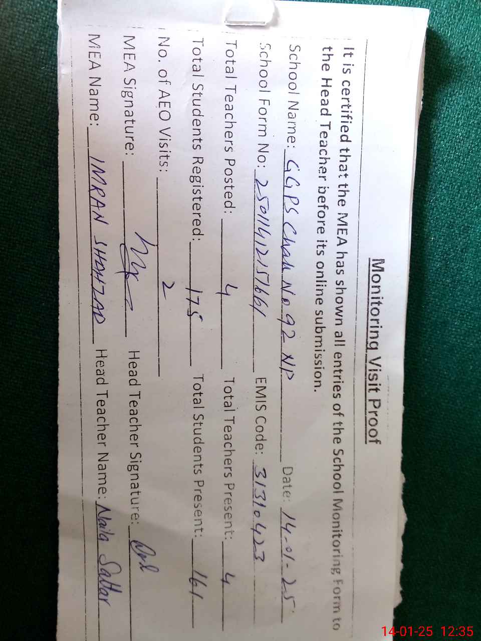 | Attendance Register | Head Teacher | MEA with School | Visit Proof |