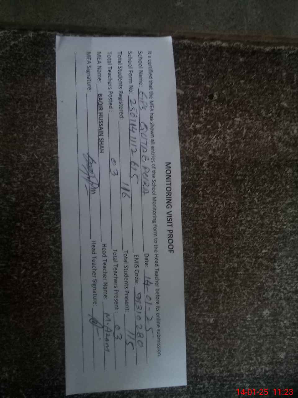 | Attendance Register | Head Teacher | MEA with School | Visit Proof |