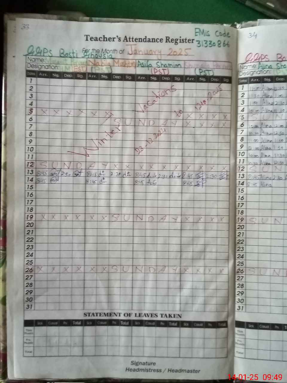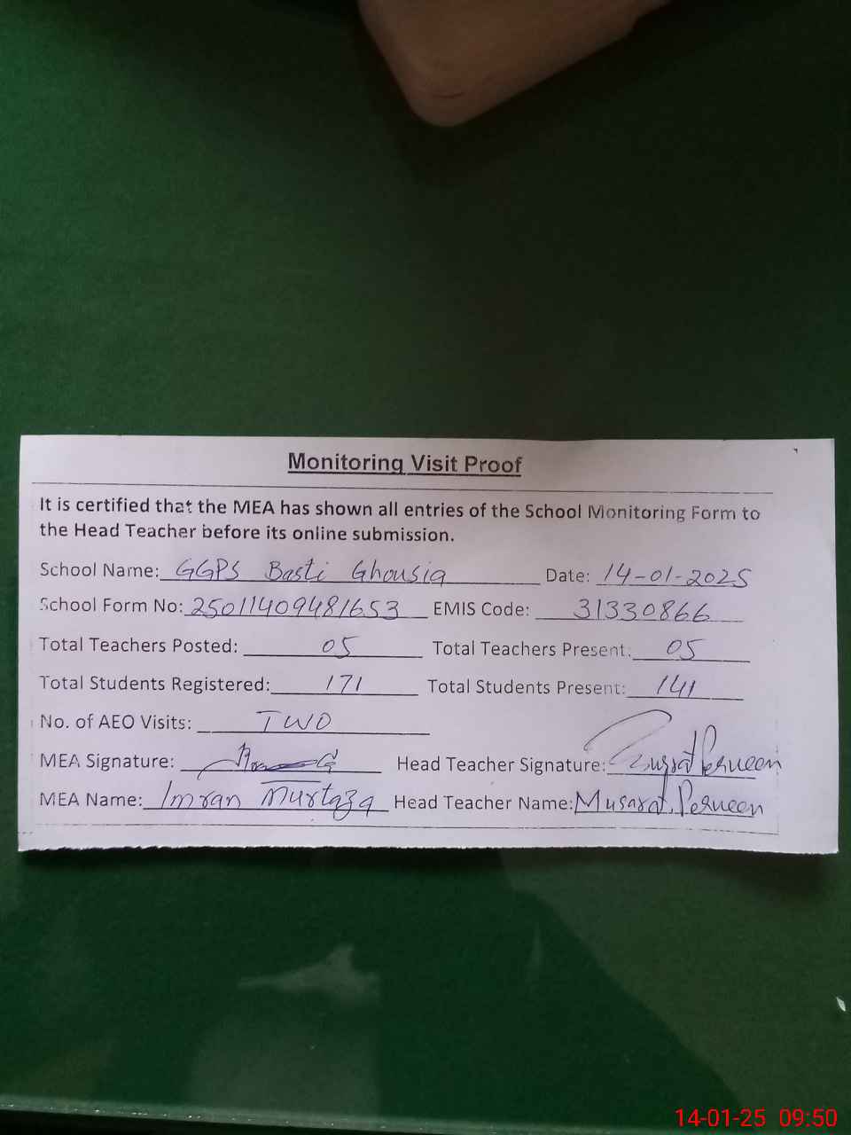 | Attendance Register | Head Teacher | MEA with School | Visit Proof |