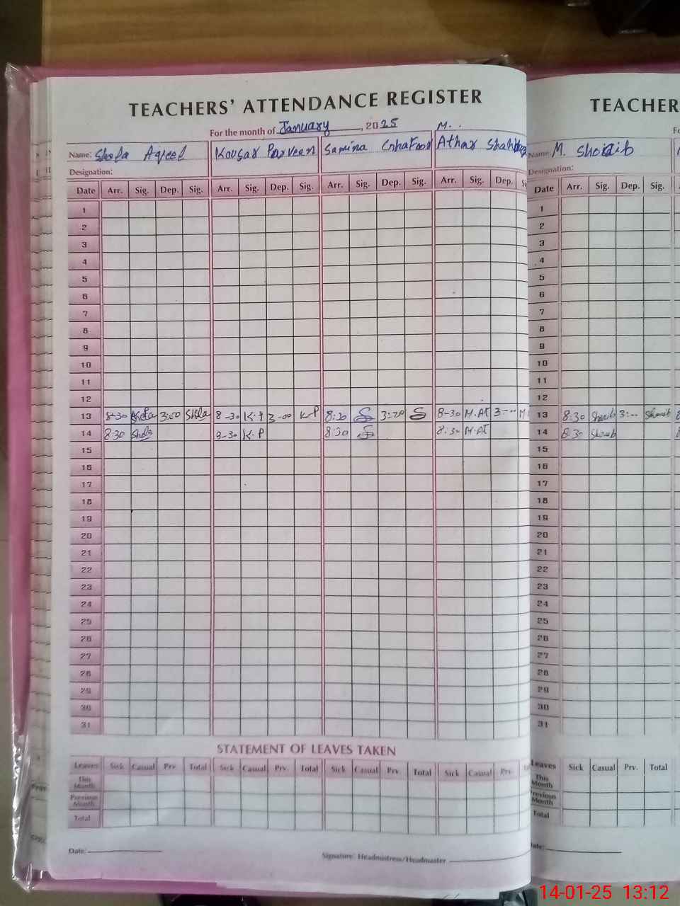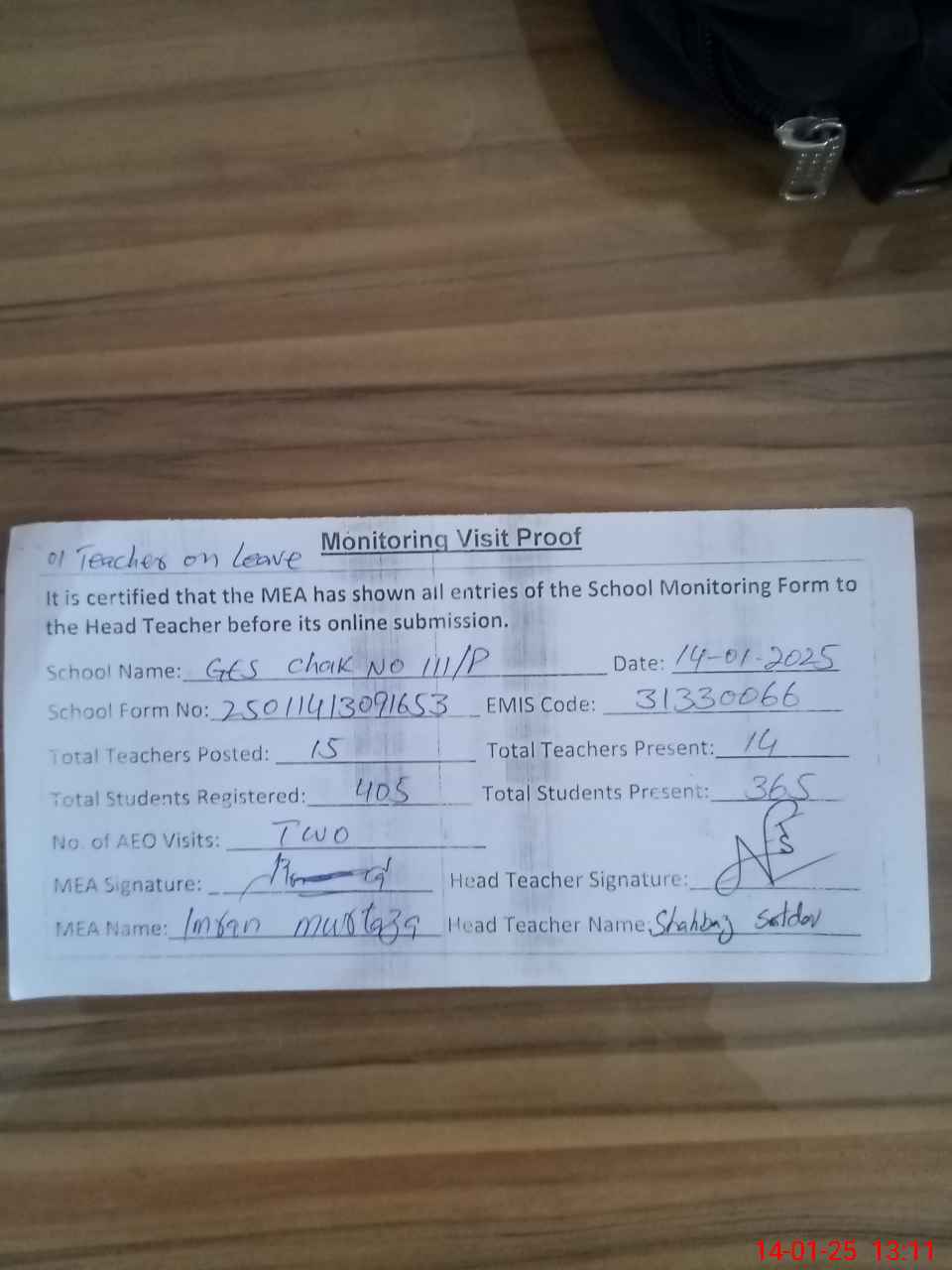 | Attendance Register | Head Teacher | MEA with School | Visit Proof |