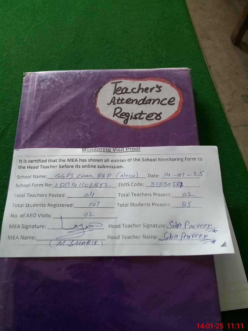 | Attendance Register | Head Teacher | MEA with School | Visit Proof |
