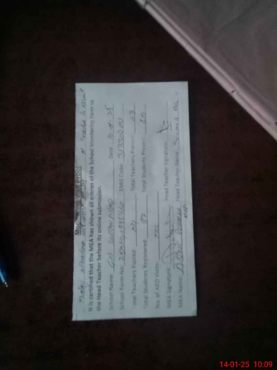 | Attendance Register | Head Teacher | MEA with School | Visit Proof |