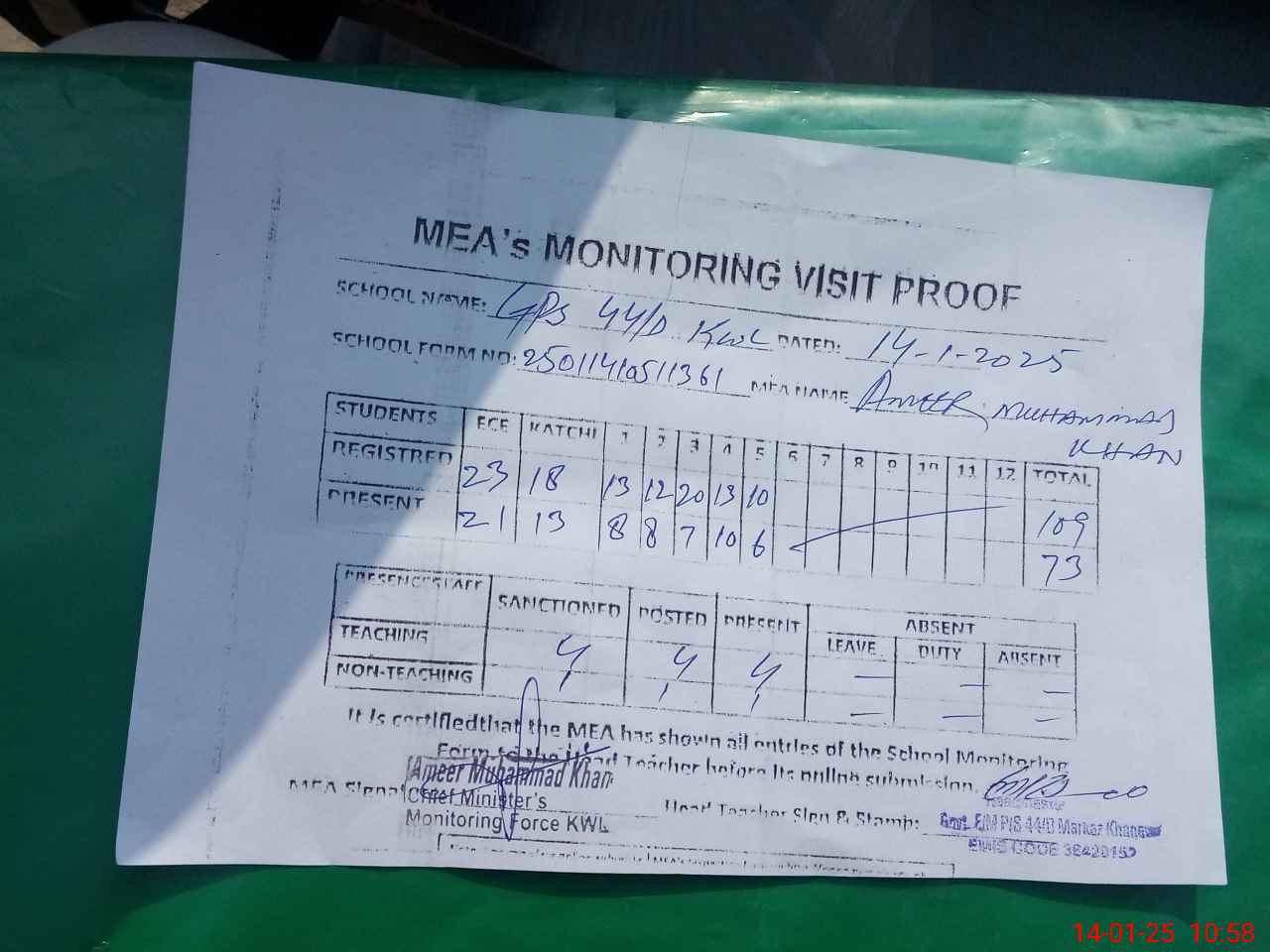 | Attendance Register | Head Teacher | MEA with School | Visit Proof |