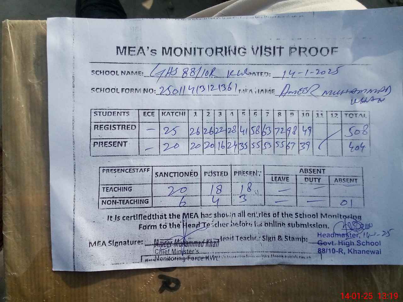 | Attendance Register | Head Teacher | MEA with School | Visit Proof |