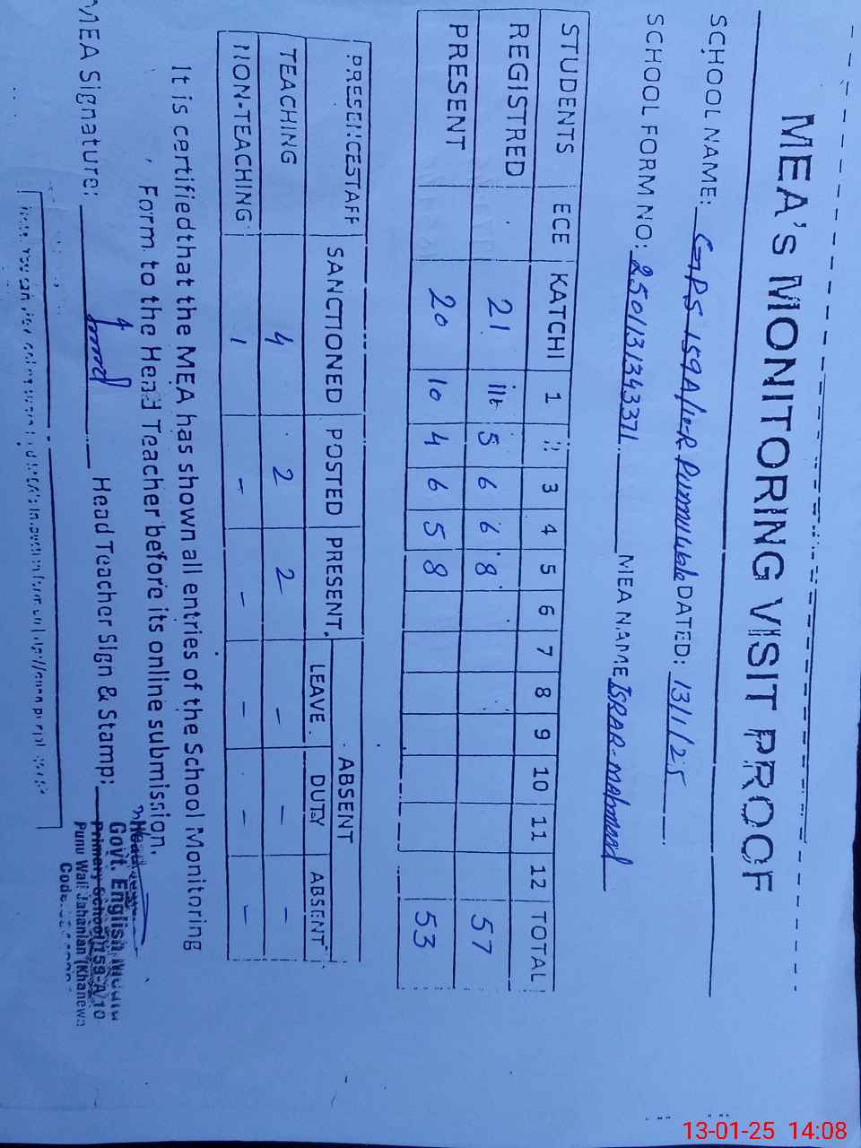 | Attendance Register | Head Teacher | MEA with School | Visit Proof |