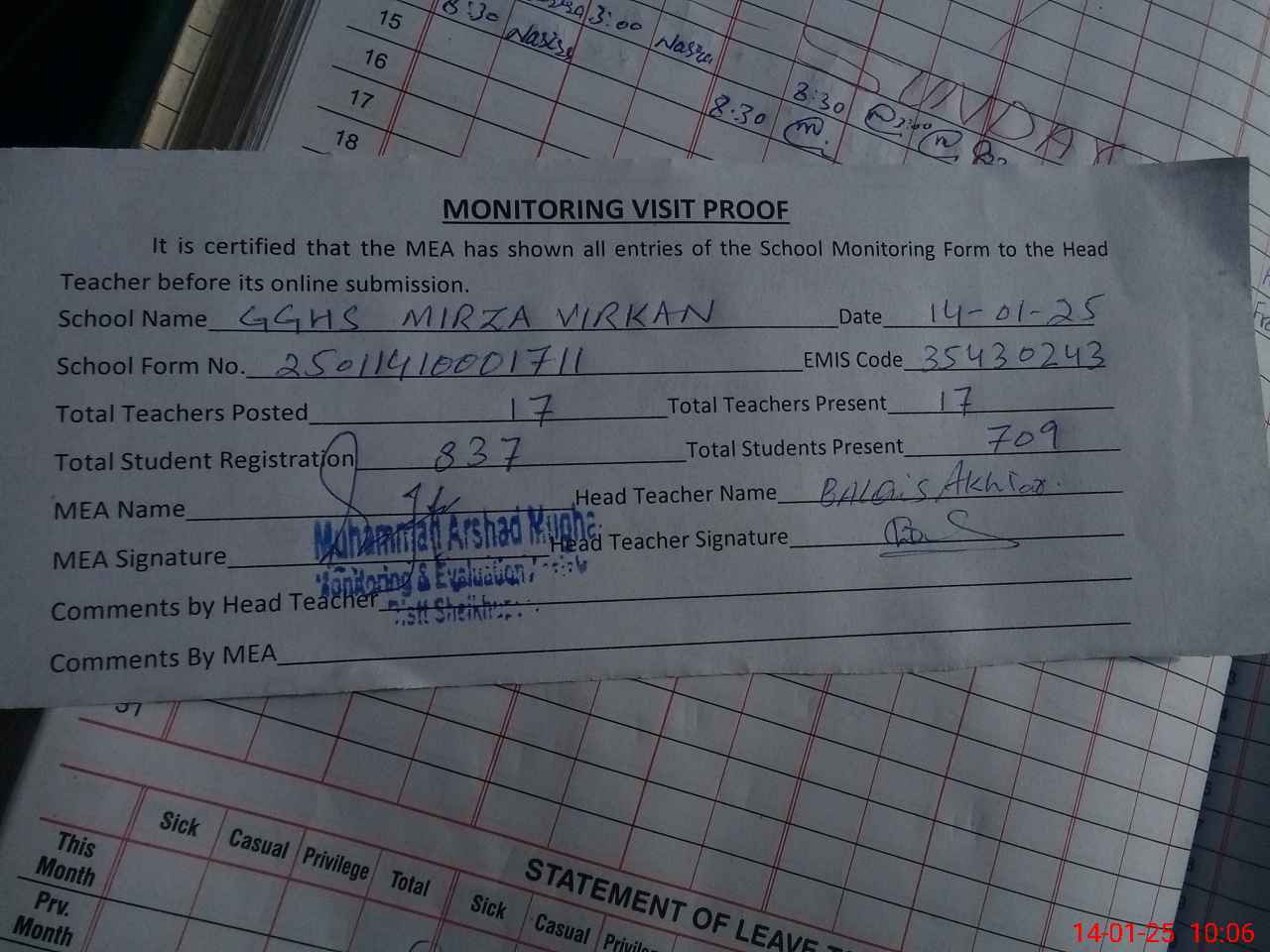 | Attendance Register | Head Teacher | MEA with School | Visit Proof |