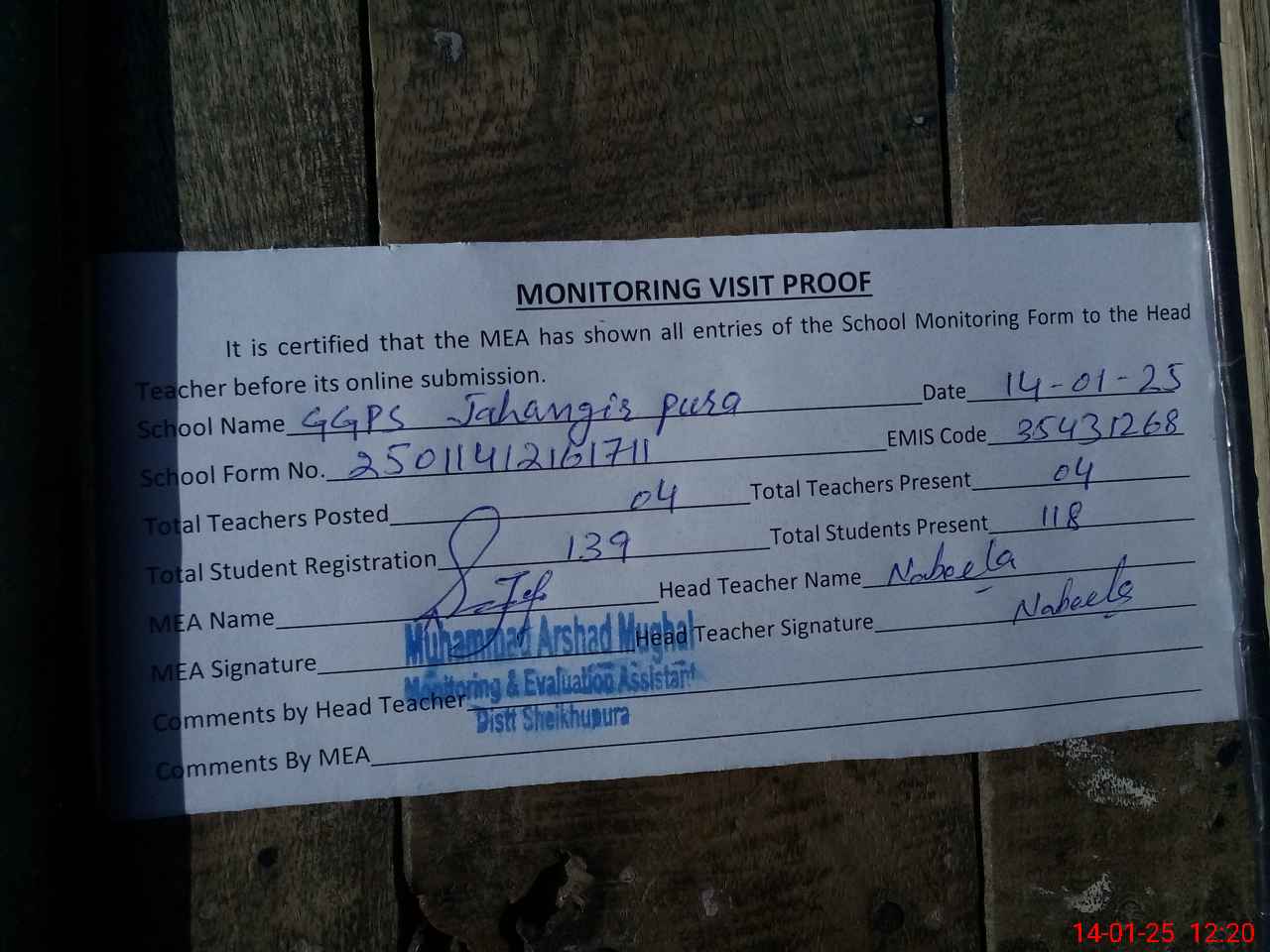 | Attendance Register | Head Teacher | MEA with School | Visit Proof |