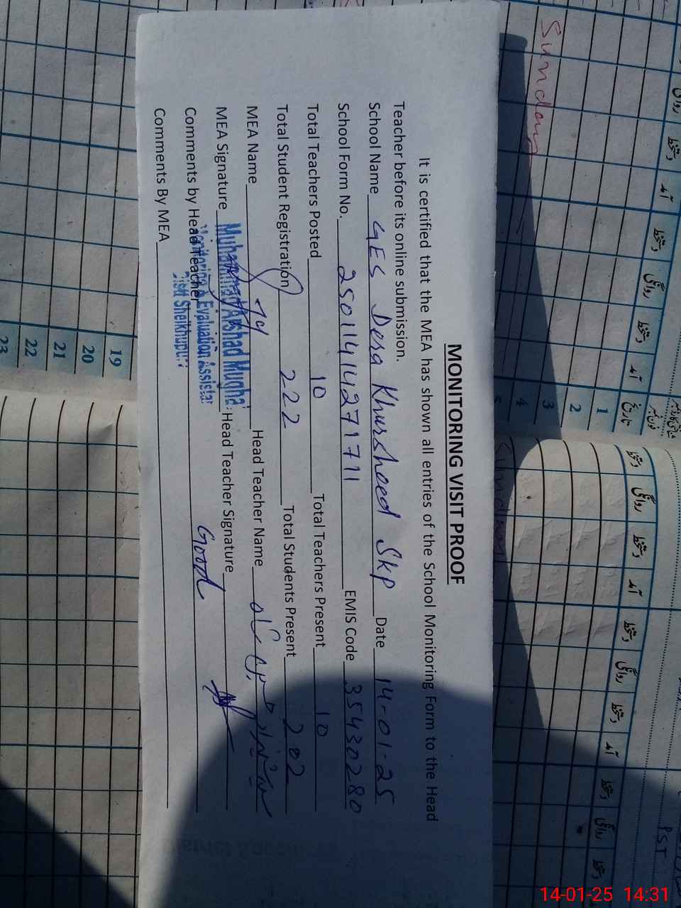 | Attendance Register | Head Teacher | MEA with School | Visit Proof |