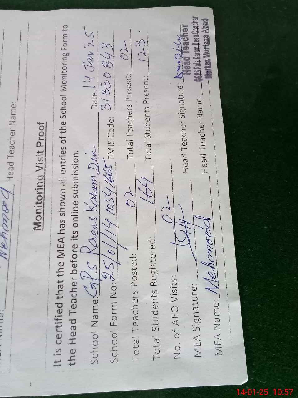 | Attendance Register | Head Teacher | MEA with School | Visit Proof |