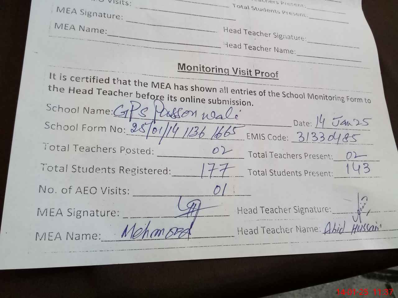 | Attendance Register | Head Teacher | MEA with School | Visit Proof |