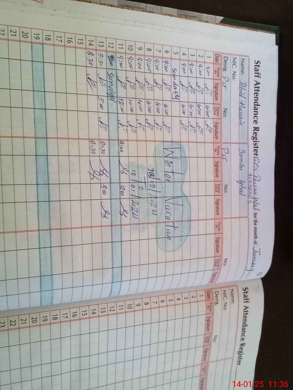 | CNIC | Full Name | Designation | R/C | Absence During Last Calender Month |