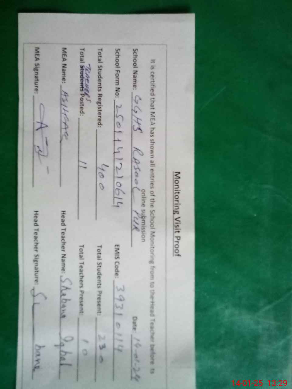| EMIS Code: 39310114 | Name of School: GGHS RASOOL PUR | |||