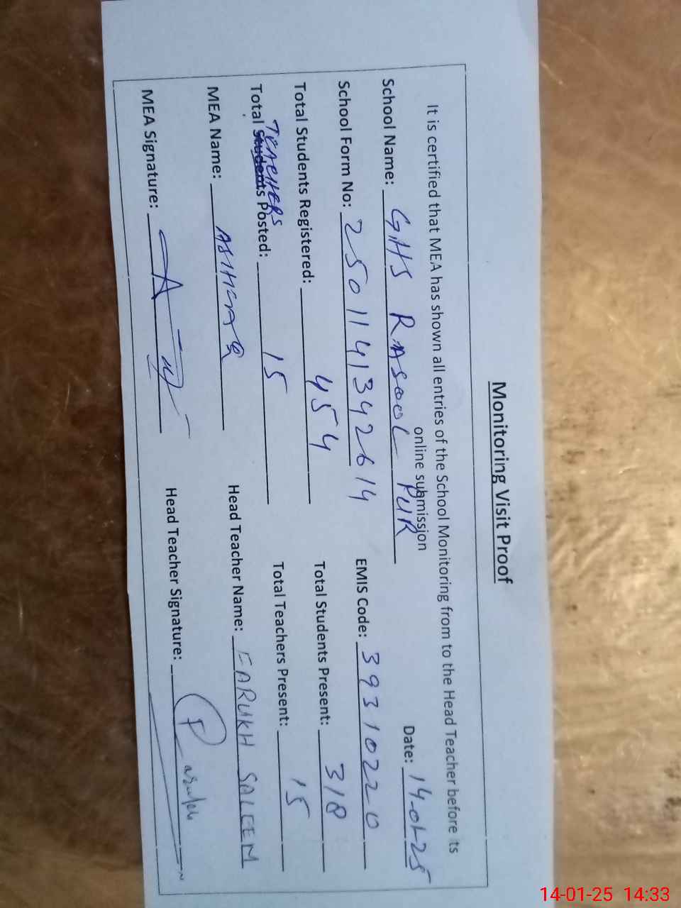 | EMIS Code: 39310220 | Name of School: GHS RASOOL PUR | |||