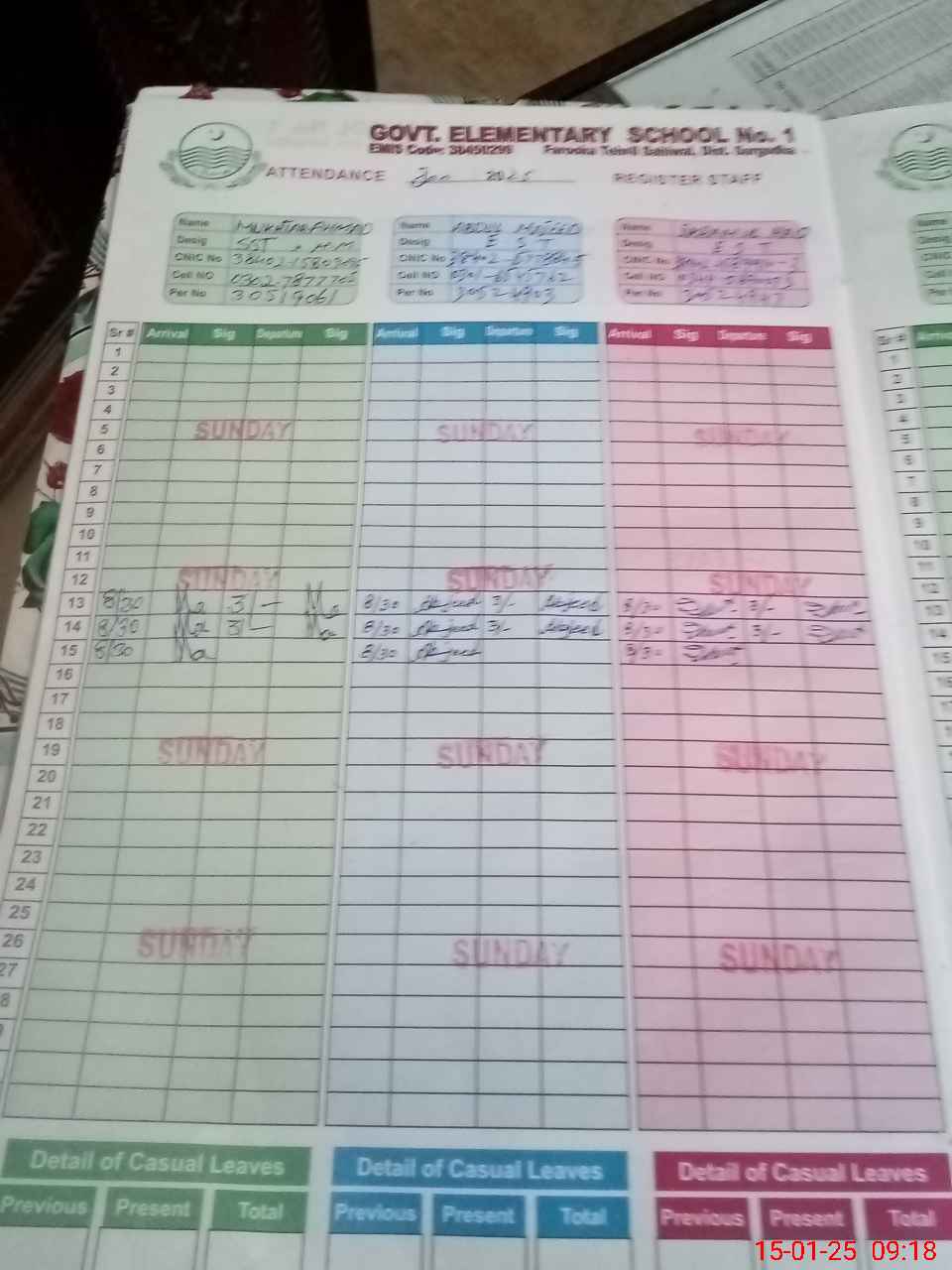| CNIC | Full Name | Designation | R/C | Absence during last cal. month |